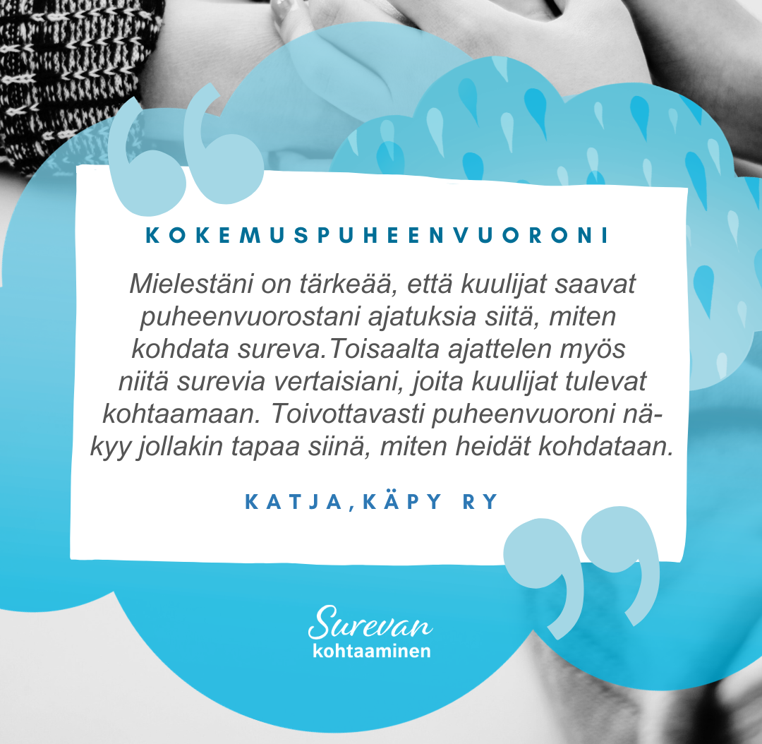 Surevan kohtaaminen -toiminnasta voit pyytää kokemusasiantuntijan puhumaan esimerkiksi työpaikalle tai oppilaitokseen. Kokemuspuheenvuoroissa kokemusasiantuntijat kertovat oman kokemuksensa läheisen menetyksestä. Lisäksi he kertovat kuulijoille yleistä tietoa surusta, surevan kohtaamisesta ja tarjolla olevasta tuesta. Puheenvuoroja järjestetään niin paikan päällä kuin etäyhteydellä, ja niitä voi tilata suomen lisäksi myös ruotsiksi ja englanniksi.
