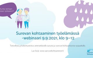 Surujärjestöjen yhteishanke Surevan kohtaaminen järjestää 9.9.2021 klo 9–12 webinaarin surevan kohtaamisesta työpaikalla. Tilaisuus tarjoaa kattavasti tietoa niin työnantajan, työntekijän kuin surevankin näkökulmasta. Monimuotoiset perheet ry:n työelämän erityisasiantuntija Tiina-Emilia Kaunisto tuo [...]