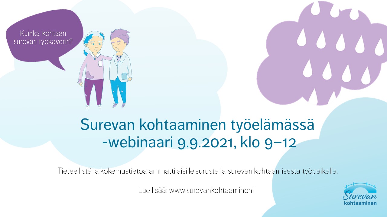 Surevan kohtaaminen -toiminta toimii myös asiantuntijana erilaisissa verkostoissa ja työryhmissä, joissa tuotetaan tai kehitetään surevan tukemiseen liittyvää tietoa tai palveluita. Lisäksi Surevan Kohtaaminen -toiminta osallistuu vuosittaisen Surukonferenssi-tapahtuman järjestämiseen. Voit kysyä meiltä myös surevan kohtaamiseen ja tukemiseen liittyviä luentoja sekä aiheeseen liittyviä haastatteluja.